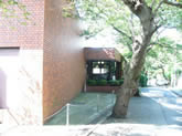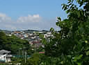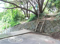 | 鎌倉山のさくら道から老舗の喫茶店・マウンテンを右折、棟方志功美術館を過ぎたT字路を右に曲がって400mくらいの突き当たりまで歩きます。車が3〜4台置けるスペースの脇に住宅街に出る急な下り階段があります。そこからの眺めはとても気持ちがいいものです。その脇に誰が作ったのか4段の木のはしごがありいかにもこれから山に入りますという風情です。そこがこのコースの入り口です。 |