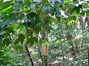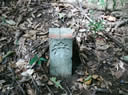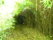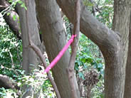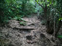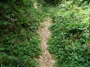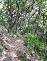 全体的に少し起伏があり、有酸素運動にもなる道は林が太陽をさえぎり、夏でも涼しいくらいで快適です。10分ほど行くと浄化センターの大きな煙突がすぐそばに見えてきます。近くが七里ガ浜の街があり、江ノ電のレールのきしむ音や近くの住宅の生活音が聞こえます。なるほど下を覗くと住宅の庭先が見え隠れしていつでも人里に降りられるようです。さらに進むと、細い竹林のトンネルがあったり、少しきつい上り坂にはロープが張ってあり安全にも気を使っているようです。 |