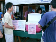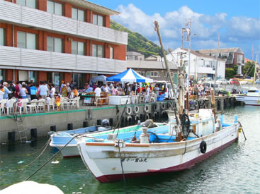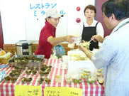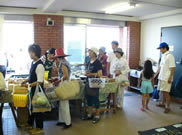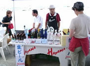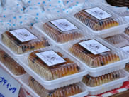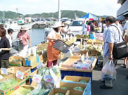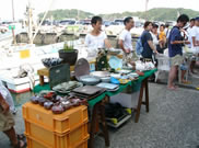 | この朝市の特徴はいろいろなお店が出店していて、まぐろやしらす、さざえなどの魚貝類から酒・ビール、農協の野菜、レストランのカレー、アクセサリーやTシャツ、アイスクリームまで種類が豊富です。特に日影茶屋の洋菓子が有名で開始前から長蛇の列が出来ていました。お望みの品が買えたお客様は用意された白いテーブルで休憩したり、食事をしたりしています。なんとなくこの朝市の人気の秘密が垣間見たような気がしました。聞くところによると他の朝市の関係者も視察に来るそうです。 |